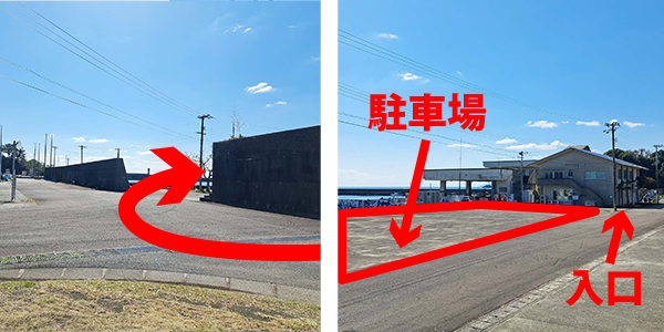 駐車場は無料です。囲みの場所にお願いします。※漁業関係者の迷惑になりますので、指定場所以外は駐車禁止です。